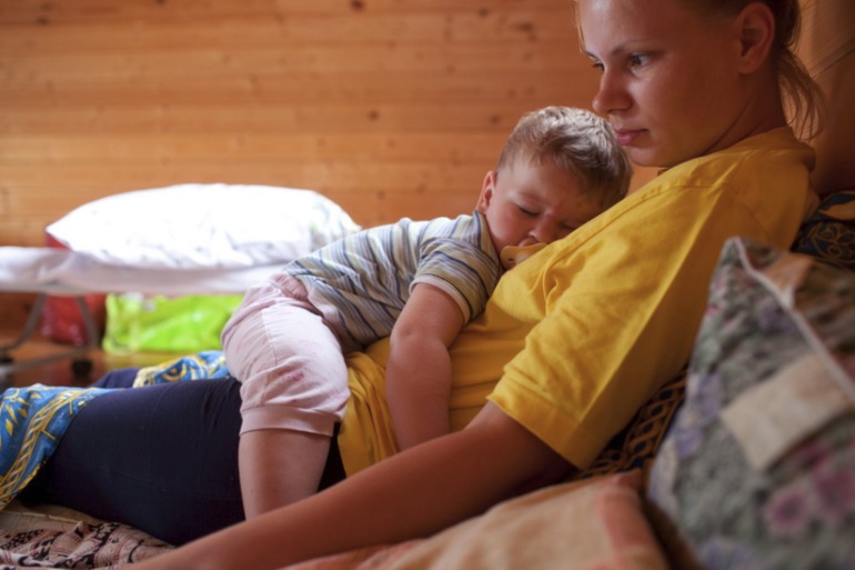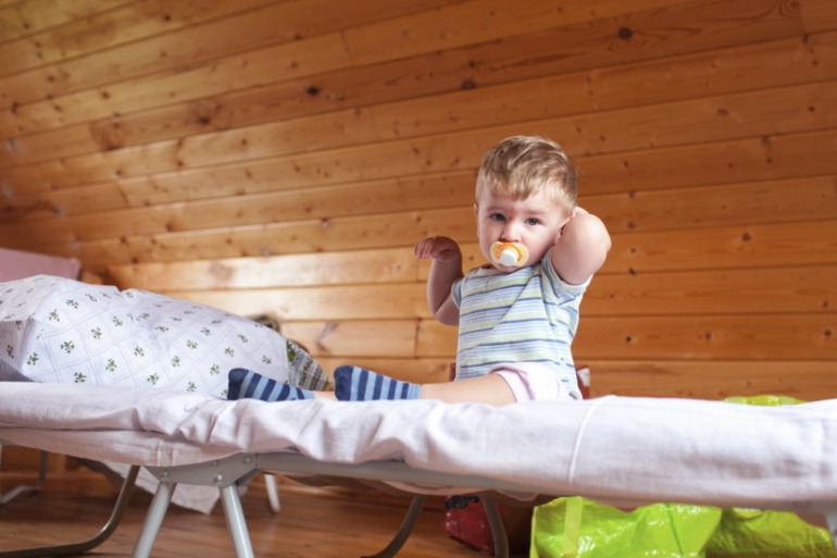 спали хорошо, днем клали на раскладушку. рядом окошко выходит на веранду - мы оттуда следили, а вниз постелили одеяла. да он и не падал. а ночью уже с нами. синяки и ушибы нормально, как без этого.
