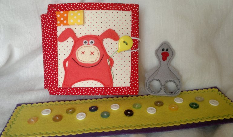 На обложке книжки поселилась толстая розовая свинка с шариком в руках. Шарик служит застежкой книжечки.