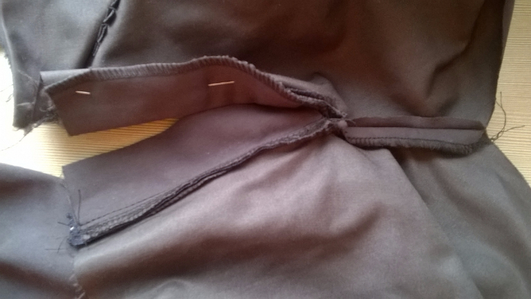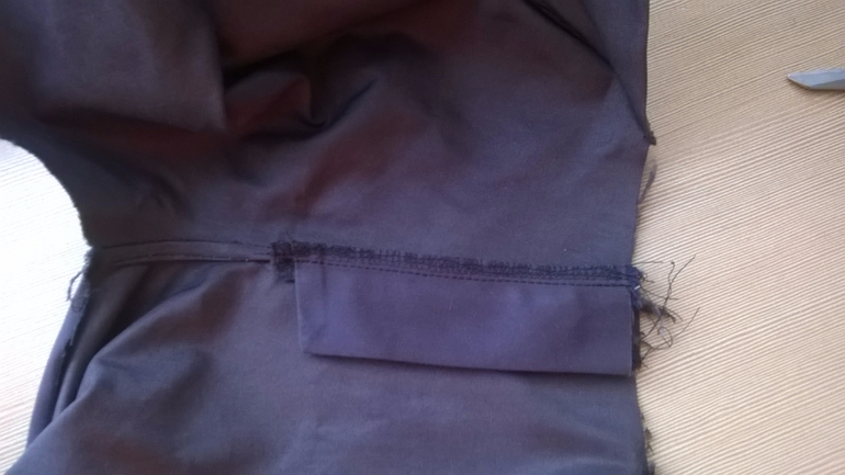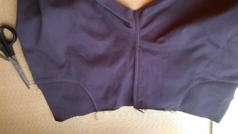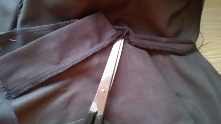 делаем надсечку (со стороны полотна которое будем подгибать чтоб получить запошивочный шов) до шва, ножницы указывают,
