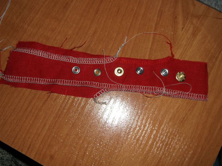 Сама кнопки ставить не решилась, попросила помощи у мужа. Вдвоем разобрались с насадками. Их 3: для альфа 12,5мм, для рубашечных 9,5мм и для люверсов 4мм. Без косяка конечно не обошлось: по незнанию под рубашечную кнопку вырезала дырку, а оказалось - не надо, дырку видно))) Ну и 2 папы поставила, перепутала. Остальное с 1 раза получилось. Вот так: