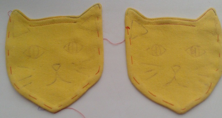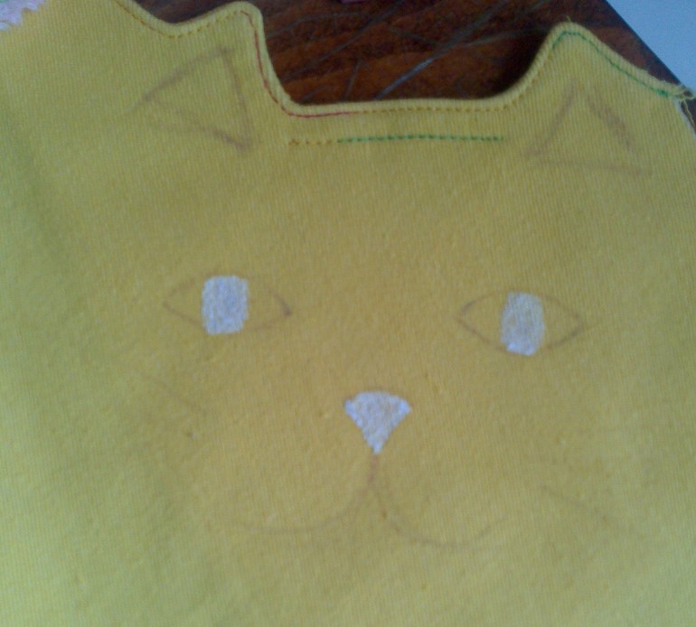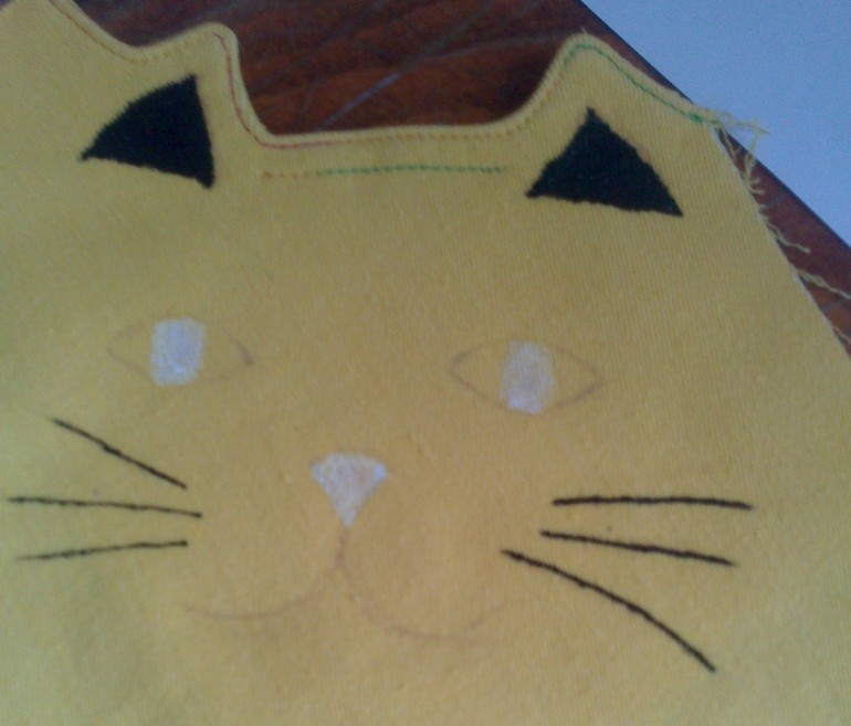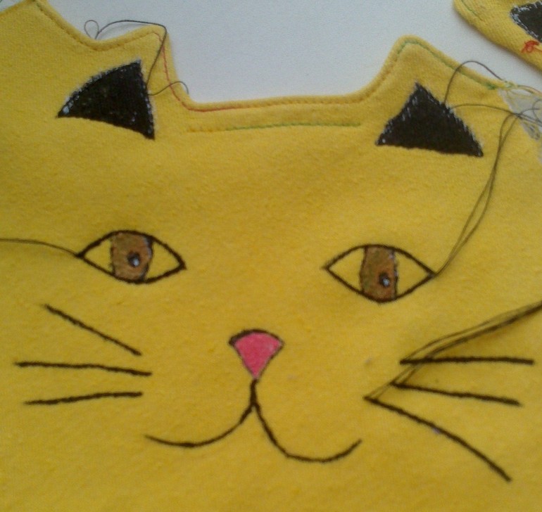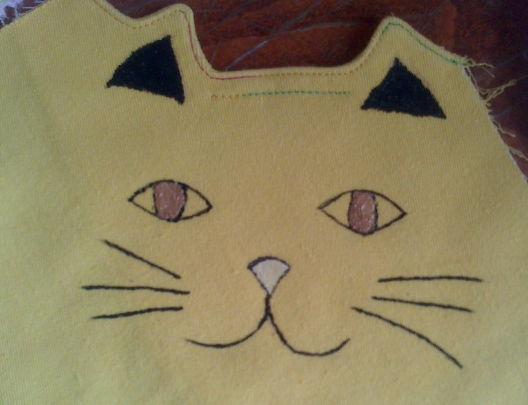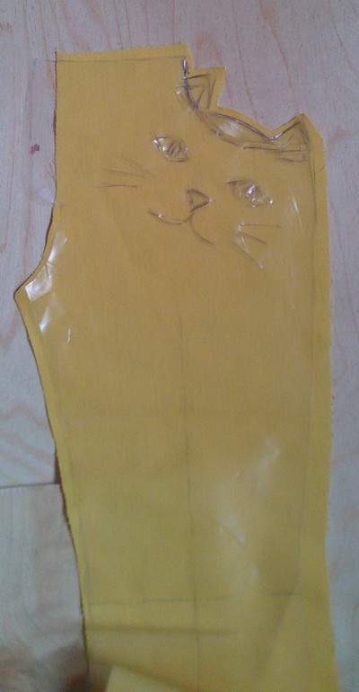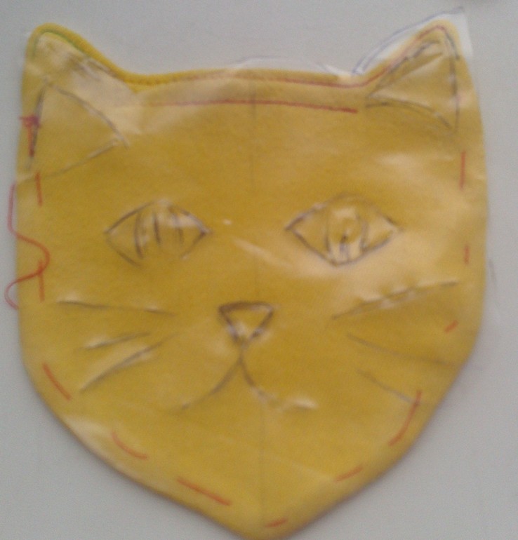 Во-первых на выкройке из пленки (бумаги и .т.д.) делаем заготовку кошачьей мордочки. От руки рисуем форму ушек. Мордочку и ушки я рисовала водорастворимым фломастером по ткани.