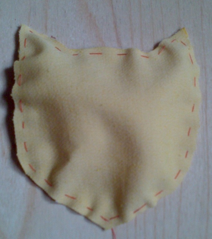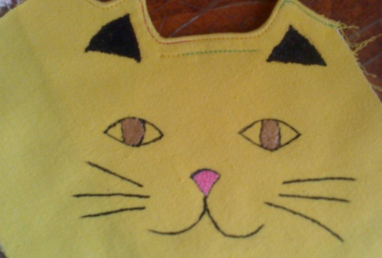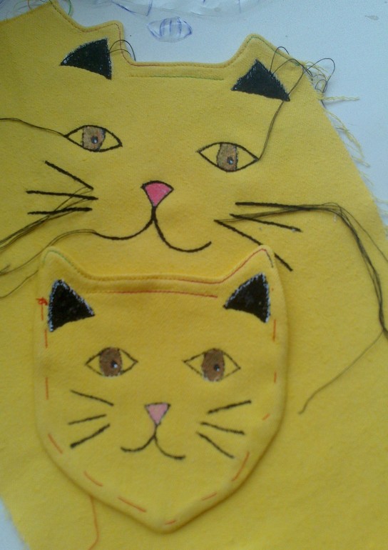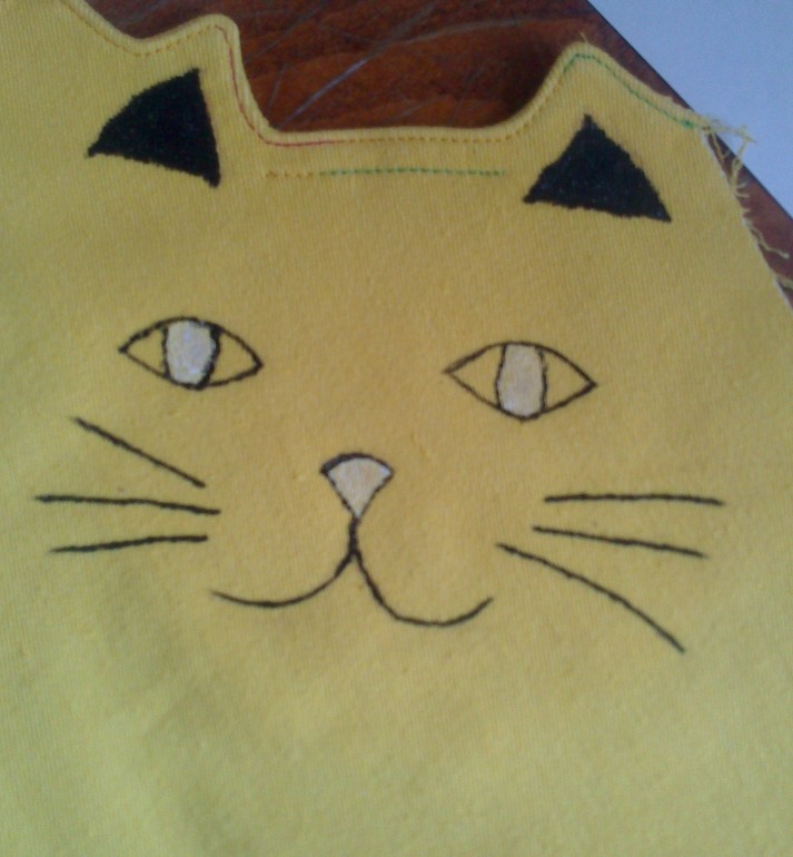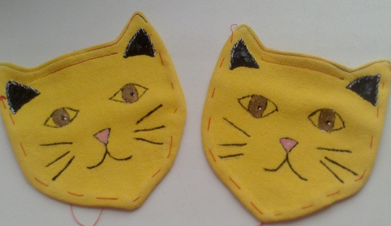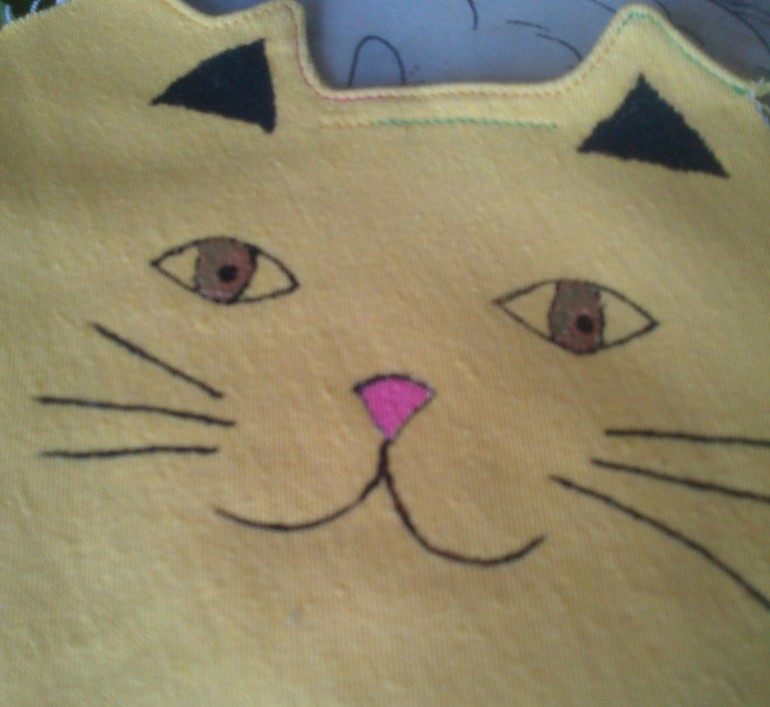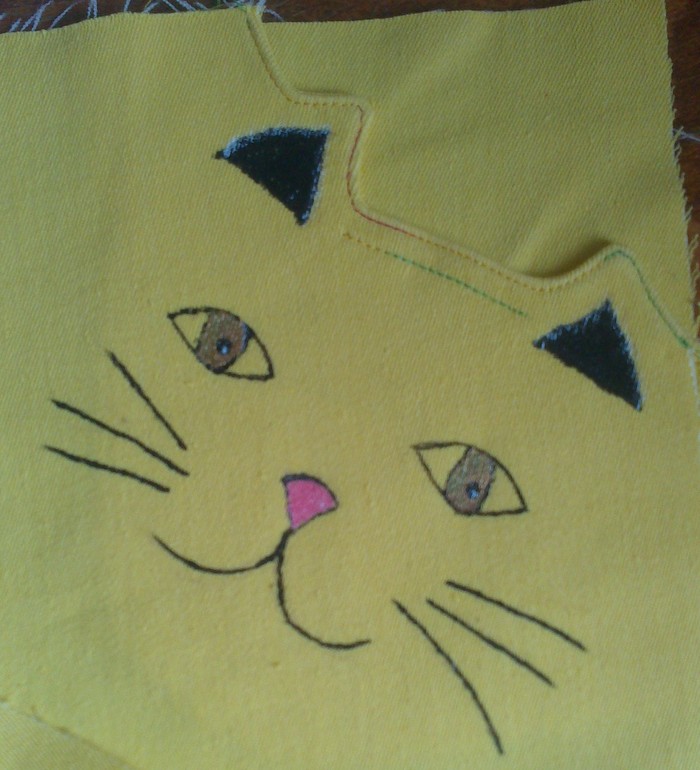 Во-первых на выкройке из пленки (бумаги и .т.д.) делаем заготовку кошачьей мордочки. От руки рисуем форму ушек. Мордочку и ушки я рисовала водорастворимым фломастером по ткани.