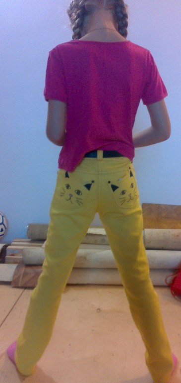 Доча любит кошек. Увидела я у Н&M шортики с карманом-кошкой, и как-раз на повестке дня стояли джинсы. На шортах была вышивка, я решила разрисовать красками. Сразу говорю я далеко не профессионал в рисовании, да и в создании МК тоже. К тому ж последний раз краски в руки брала полтора года назад.Но попытаюсь. Фото с телефона, пока такие.