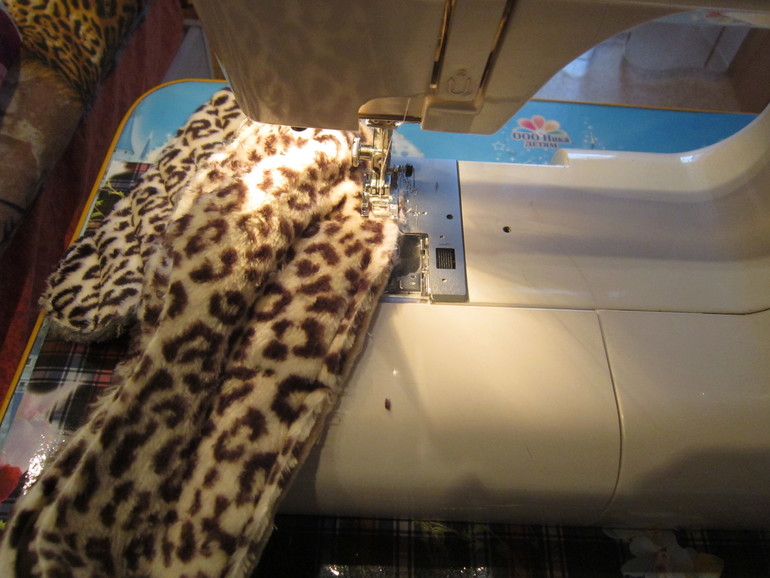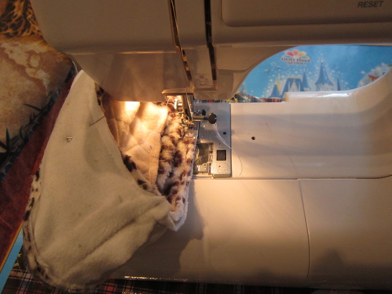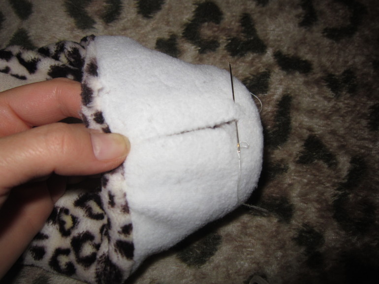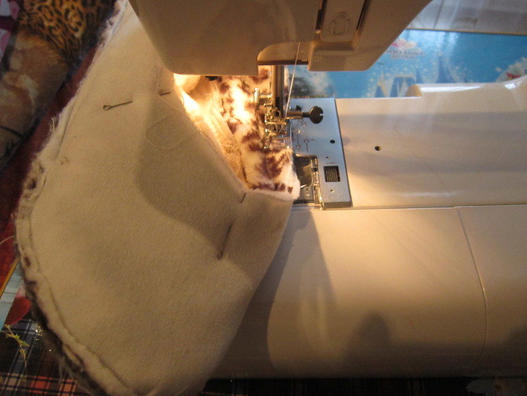 На внутренней заготовке из флиса оставляем в середине не зашитым шов, прошиваем только по краям. Это отверстие нам понадобится в конце для выворачивания тапка.