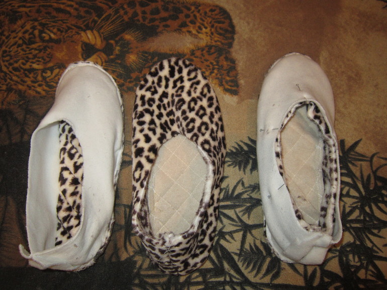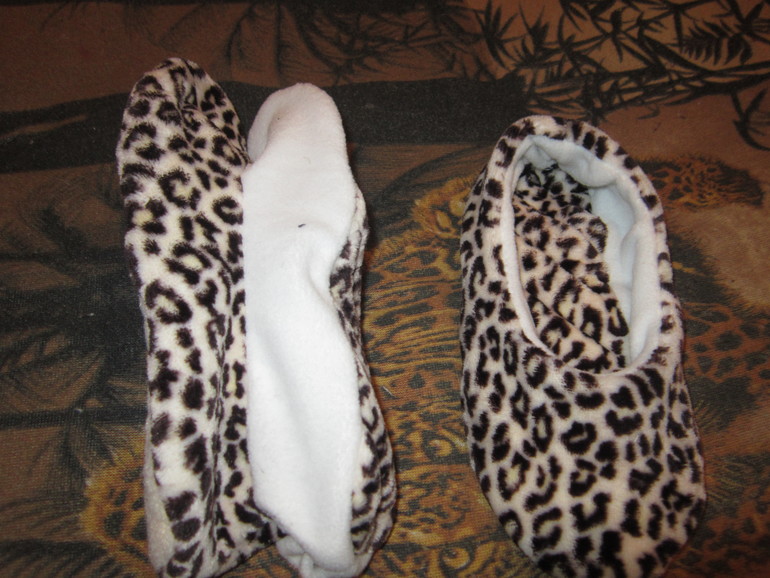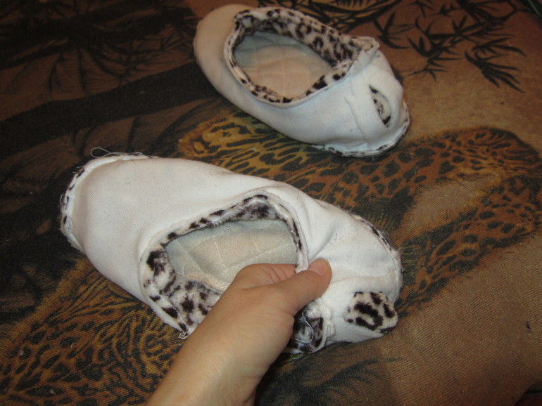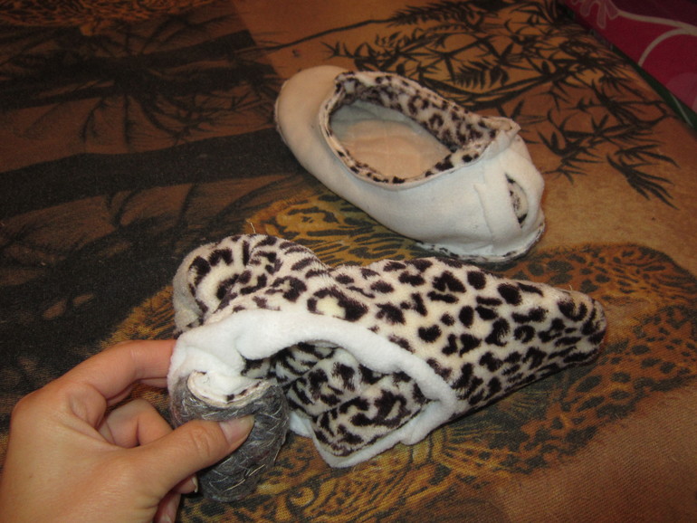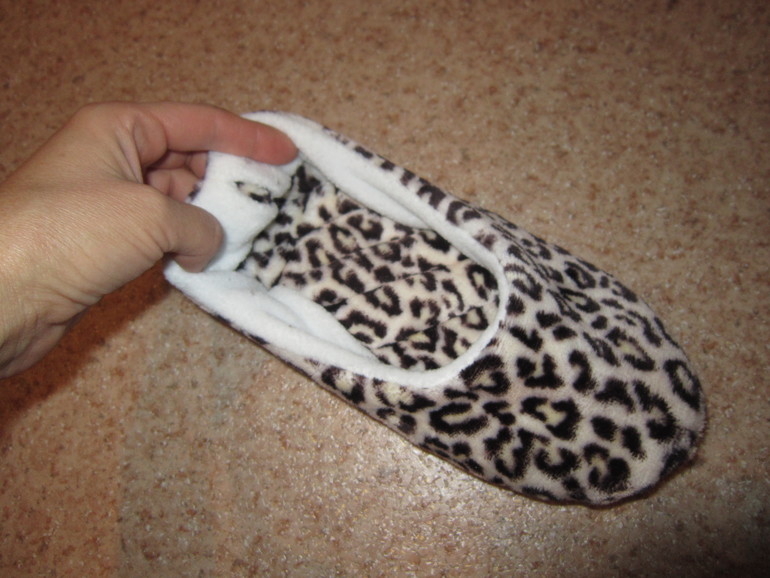 теперь внешний тапок ( у меня из велсофта) вставляем во внутренний . Обратите внимание, что лицевые стороны смотрят вовнутрь.На верху должен оказаться внутренний тапок с изнаночной стороной.