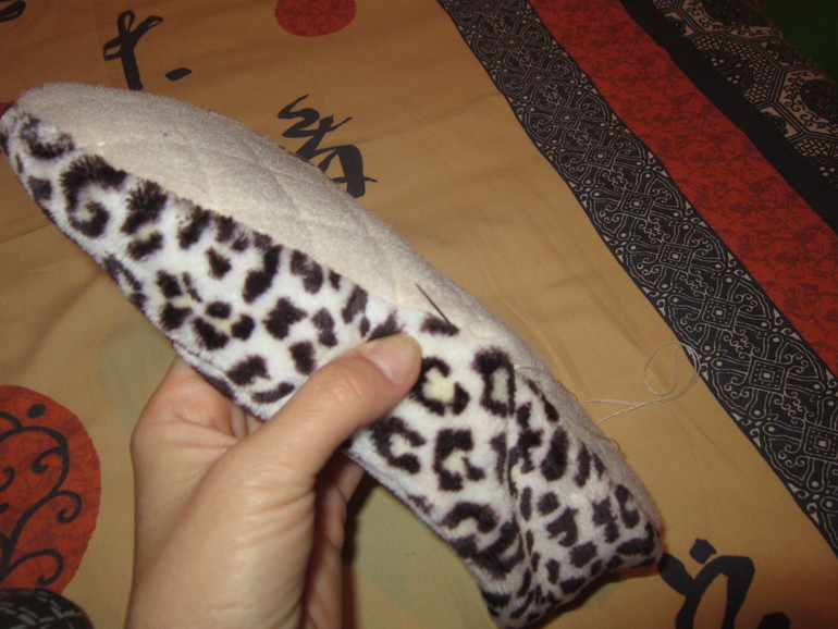 Затем так же в ручную прошиваю по периметру подошвы, как бы соединяя внутренний и внешний тапок. Получается очень комфортно. При быстром снимании и при стирке в машине-автомат тапки не теряют своей формы и не выворачиваются.