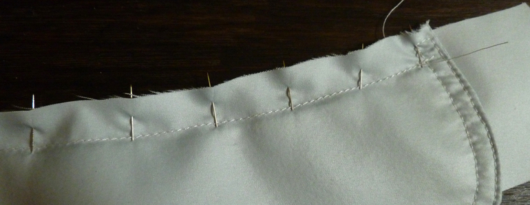 Наметать вторую часть стойки, совмещая линиию со строчкой. Части, проклеенные флизелином на воротнике и стойке у нас лежат лицом к лицу. Пристрачиваем строчка в строчку.