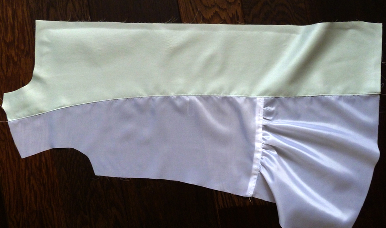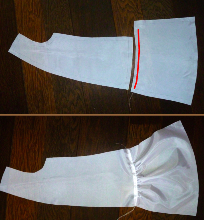3) Собираем подкладку. См. фото ниже. Прострочить широким шагом (3-4) нижние детали (в инструкции №4 и №5) по красной линии указанной на фото до меток и присборить. Сшить детали полочек №1с нижними деталями №4. Сшить деталь спинки №2 и нижнюю деталь №5.