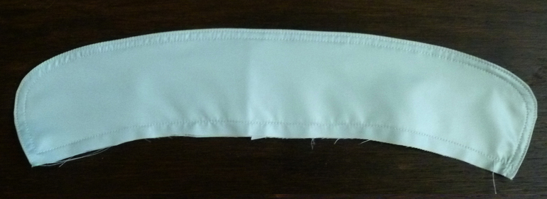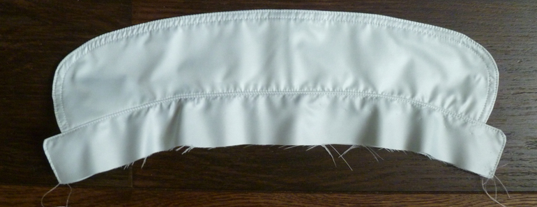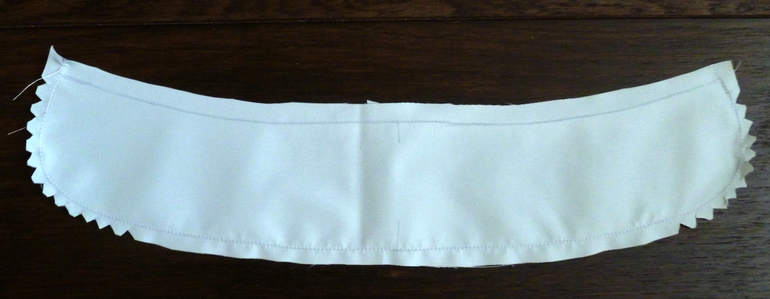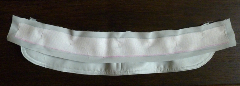 Выворачиваем и отстрачиваем двойной строчкой. Флизелином проклеена та часть, которая при отвороте смотрит вниз. Прострачиваем нижнюю часть воротника, эта строчка будет служить нам ориентиром в дальнейшей работе.