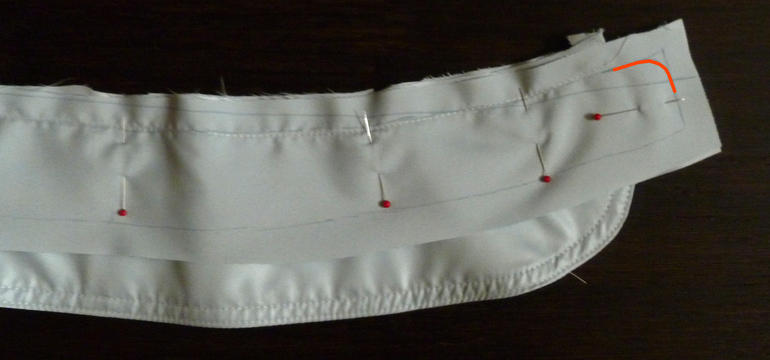 Оформляем стойку. В выкройке данной в журнале уголок стойки прямой, я сделала его закругленным. См. красную линию на фото. Прострачиваем боковые части стойки и подрезаем (как в случае с воротником изгибы зубчиками).
