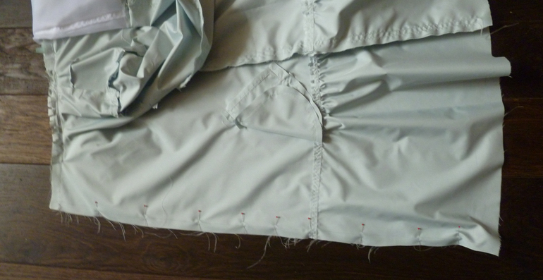 1) Подготовка ткани (декатировка). Перед тем, как начать раскрой ткани ее необходимо постирать. Это делается для того, что бы потом подкладка не села. Плащевку можно не стирать, она обычно не садится, а вот подкладочную ткань обязательно. Замочить в теплой воде или постирать в машинке при 30 градусах, отгладить.