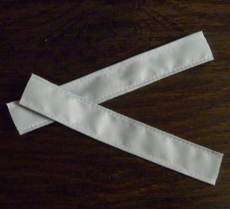 Отмеряем на ткани полоску равную ширине шлевки, прибавляем столько же и с каждой стороны по 1 см на припуск. Длину полоски берем из расчета сколько шлевок нам необходимо ( в нашем случае 6 шлевок, 4 шт для рукавов и 2 для пояса) плюс по 1 см с каждой стороны для припусков. Длину шлевки рассчитываем так, ширина пояса плюс сантиметр для свободного скольжения и плюс 2 см на припуски (по одному с каждой стороны). Так же рассчитываем для рукава. Получили длинную полоску ткани. Не надо нарезать ее на шлевки сразу, изготавливать легче одну длинную, а потом нарезать.