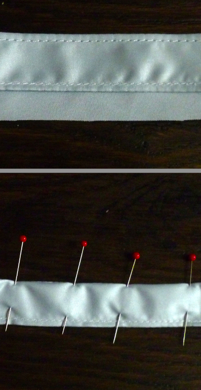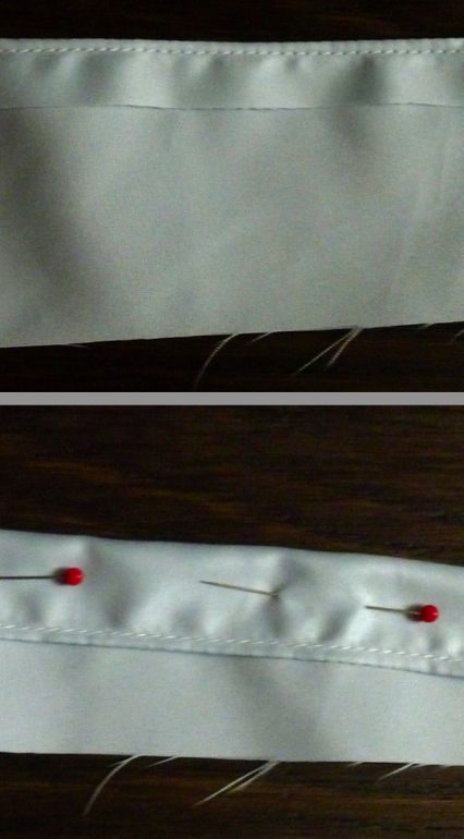 Подогнули с одной стороны припуск в 1 см и отстрочили. Потом подогнули ширину шлевки и отстрочили по сгибу. Затем подогнули оставшийся припуск в 1 см и совместили с отстроченным краем, закрепили булавками или наметали и отстрочили шов в шов.