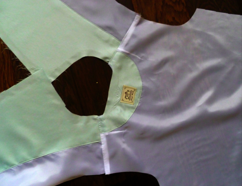 Совмещаем центры и наметываем подкладку к основной ткани. Внутри воротник. Пристрачиваем.