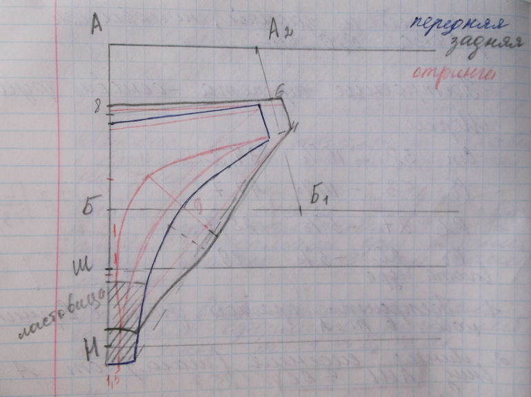 Вот такой чертеж должен получиться. Здесь карандашная линия - задняя половинка, синяя ручка - передняя половинка, красный карандаш - стринги.
