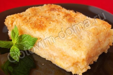 Очень вкусный! Много лет пеку только его. Пеку в форме и потом из неё лопаточкой накладываю на тарелочки - вкуснее тёпленький с ванильным кремом или шариком ванильного мороженого. Холодный тоже вкусный, но обычно он до такого состояния у нас не задерживается. Дети просят печь такой пирог на крестины, праздники, когда мы едем к ним в гости и ожидается большое количество гостей, тогда холодный едят...