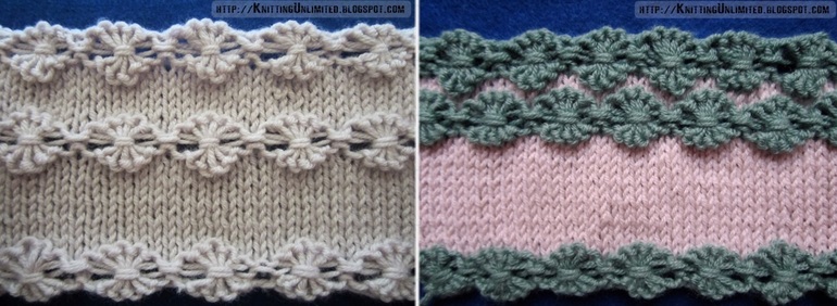 УЗОР "ПАУЧКИ" правда там на английском, но есть видео, где всё понятно... И ещё - там делают три накида, а с моими нитками и спицами лучше смотрелось четыре, так что надо пробовать вязать и выбирать как будет больше похоже на оригинал.