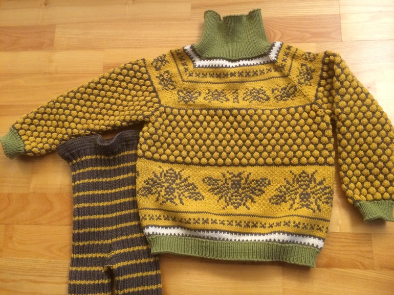 С пчёлками муж выбрал из трёх предложенных мною вариантов для внука, пришлось на ходу рассчитывать схемы узоров, чтобы по петлям подходило, в общем работы с этим свитером было достаточно...