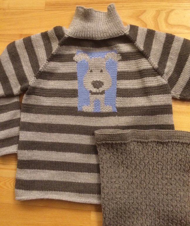 Свитер с собачкой получился не совсем такой как я хотела, почему-то я думала, что картинка будет крупнее и, вроде бы, по рядам посчитала, ан нет, промахнулась, надо было схему увеличить по петлям и рядам, а я доверилась готовой.