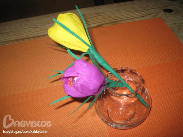 Вот такие крокусы получились на пробу. Основу сделала из конфет чупа-чупс. Сделала пока два (больше пока не нужно), но на этом не остановлюсь - процесс очень увлекательный...