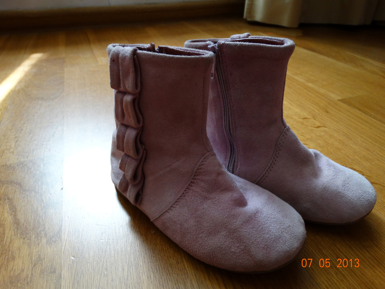 Итальянские замшевые сапоги, слегка розового цвета, сзади на липучке, мы в них седели в коляске размер где-то 19-20 по стельке 12,5 см., 700 руб. ,состояние отличное,