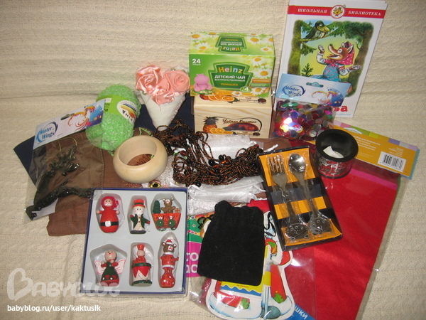 Катюша, оооочень рада что вам все понравилось :))) Долго вам все это собирали :))) Правда я думала, что подушечки с ежиками деткам, а бык - Матвею, просто это единственное "недевчачье", что нашлось из мягких игрушек :)))) И мне его правдаподобие понравилось :))) Но раз он Милане полюбился - так вообще здорово!А браслет деревянный - тебе на обвязку :) Ну или может ты что из фетра придумаешь... в общем ты наверняка что-то очень классное придумаешь!Мы вашу посылочку тоже получили! Завтра постараюсь хвастик выложить :))) Спасибо большое! Очень все классное и новогодее :)))))))))