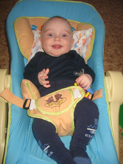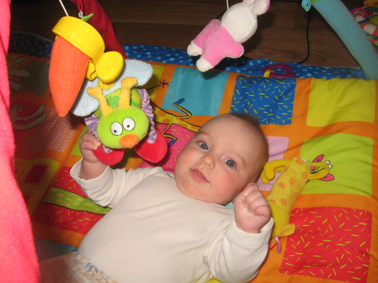 Переворачивается и на живот, и на спину, крутится. Пытается сесть из положения полулежа. Наконец-то держит погремушки хорошо в руках, тянет игрушки с коврика.