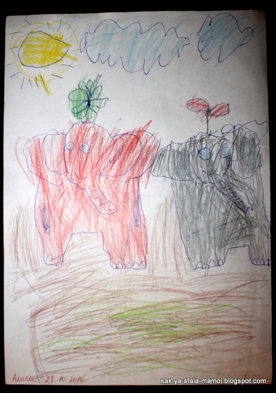 Я все больше думаю о том, что с каждым годом учить (это слово не подходит, конечно, здесь, но другое я пока не придумала), так вот, с каждым годом учить ребенка второму иностранному языку все сложнее в домашних условиях. Одновременно, я продолжаю считать, что именно дома в отношениях "родитель - ребенок", когда хотя бы один выражает искреннюю заинтересованность темой, интерес перекинется и на другого. Но нам, "заинтересованным родителям" нужно искать все больше и больше разных "ключиков", чтобы увлечь ребенка за собой в мир иностранного языка. Я у себя в блоге написала о рисовании на французском языке. Это одно из любимых детских занятий, за котором они могут просиживать часами и во время которого можно выучить, ненавязчиво, легко, интересно, очень много нужной лексики. Заходите на блог, читайте, комментируйте! Всем всегда рада! А это Алисины слонихи, которых она нарисовала именно в результате таких вот французских уроков.