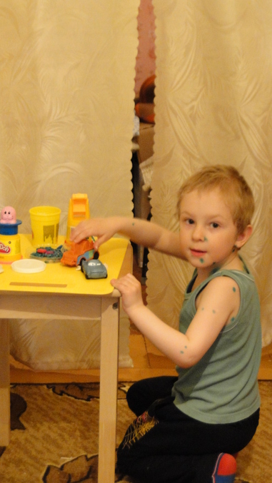 Обсыпан весь, пузырики и зеленкой измазан)))но не унывает мой малыш, так же активен, весел, даже аппетит есть,что самое главное...