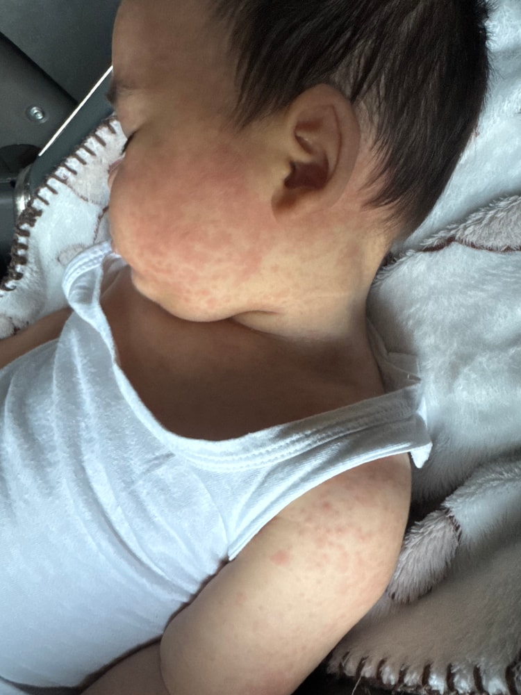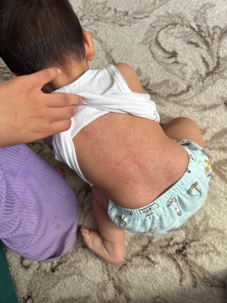 Вот сейчас такая же сыпь.На прошлой неделе во вторник утром поднялась температура 39,продержалась до вечера четверга,воспалился лимфоузел,горло красное было,сопли.В пятницу все симптомы исчезли вместе с температурой.Выходные провели здоровыми,в понедельник пошли в садик,а вчера звонят из садика и говорят забирайте ребенка его всего обсыпало сыпью.Ребенка мы забрали,обратились к дежурному доктору,нас на всякий случай положили в больницу,антигистаминные не помогают,сыпь становится больше