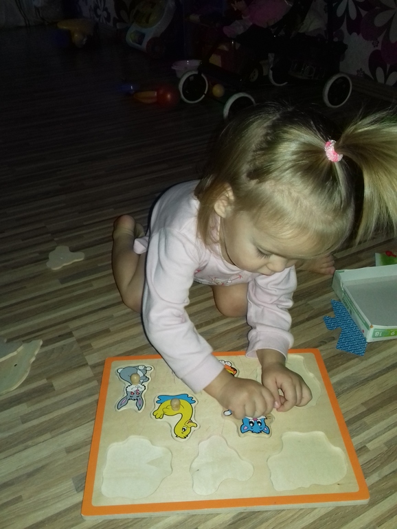 Обожает пазлы. Из 2х деталей собирает легко, осваивает из 6ти