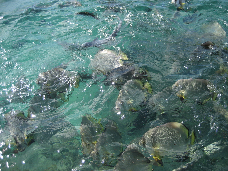 рядом плавают другие любители красивого, расслабляешься и уже полностю сливаешься и чувствуешь себя спокойно, паря на глади воды и сверху наблюдая как суетятся внизу вокруг кораллов рыбки, как затаился в песке скат, как стайки рыб в испуге быстро уплывают от тебя. А ты плывёшь и за каждым углом встречаешь что-то интересное, фотографируешь самые яркие кораллы, рыбок, которые подпускают к себе поближе, будто специально позируют, девушек, проплывающих мимо... Так, о чём это я? Ах да, о рыбках. Чего стоит только рыбка клоун - эта оранжевая с полосками из мультфильма, которая словно ласкается в своих водорослях. Та словно вообще улыбается, а подплываешь ближе, так выныривает из этих самих мягких водорослей к тебе навстречу, будто приветствует... А может есть просила? А главное всё это можно трогать. Единственно некоторые кораллы имеют самозащиту в виде лёгких токсинов. Если взять такой пальцами, то ничего, а вот на остальной коже, что нежнее, может быть лёгкий ожог, как от крапивы. В течении дня происходит отлив океана и довольно большая территория дна обнажается, поэтому и сами кораллы оказываются ближе к поверхности воды.