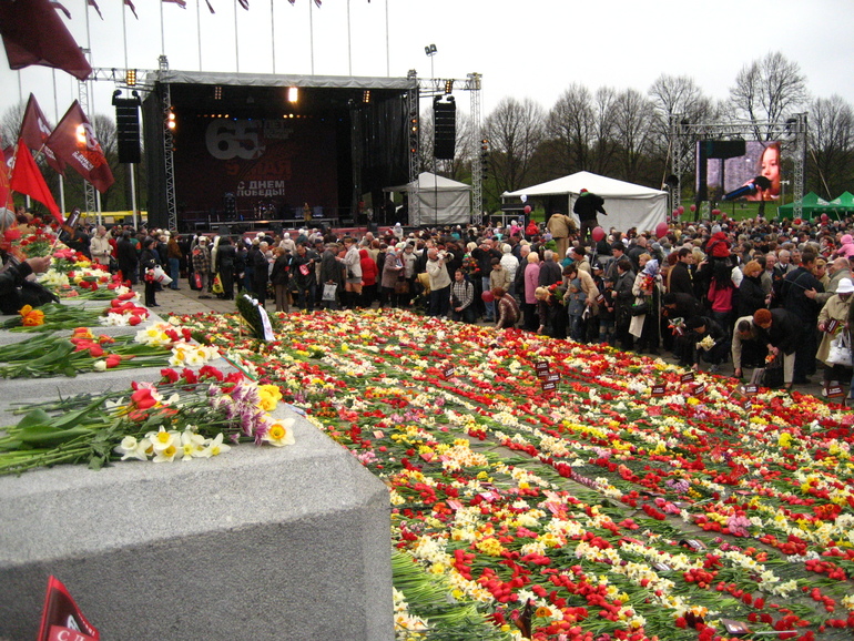 Так получилось что 9-го мая, то есть в день Победы мы находились в Латвии, и у меня впервые за долгие долгие годы была возможность посмотреть как проходит празднование этого дня. Б Австралии-то у нас этот день вообще не праздник, потому как во-первых вторая мировая для Азии (а поэтому и Австралии) закончилась с победой над Японией в сентябре 1945-го, а не в мае; а во-вторых первая мировая у нас котируется гораздо больше, как первый военный конфликт в котором Австралия принимала полноценное участие и принесший наибольшие потери. Мне казалось что праздник должен быть такой меланхоличный, торжественный, день памяти- а оказалось что это совсем не так, и народ гуляет и радуется- Победа! Мы с Сашиной мамой поехали к памятнику неизвестного солдата в Риге, где проходили большие народные гулянья, был концерт, где выступали какие-то яркие детские коллективы и взрослые участники, была разнообразная еда, (в том числе шашлыки, которые мы с большим аппетитом уплели), море цветов устилало все поверхности у памятника, и снимал какой-то телевизионный канал.