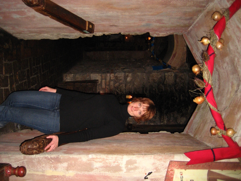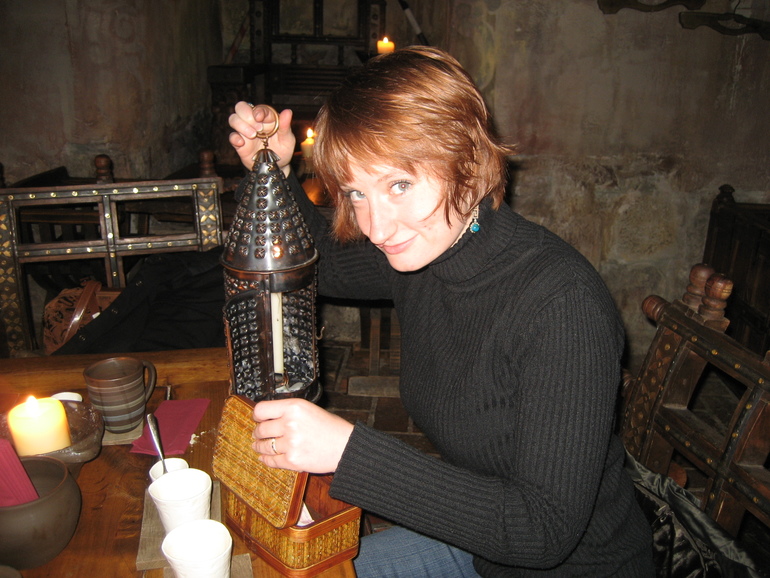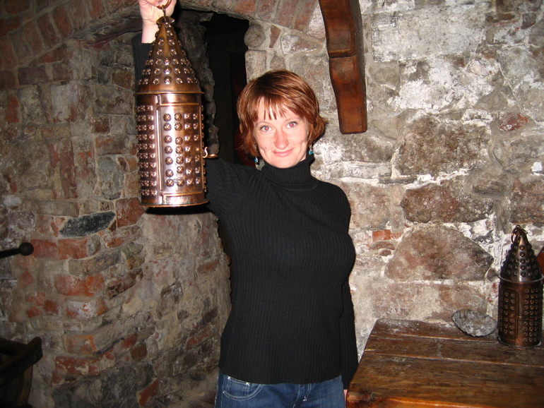 В общем, после такого политического отступления: праздник был красивый, но к сожалению было холодно, и мы изрядно подмерзли, даже с шашлыками. :) Поэтому пошли в старый город греться- зашли в очень симпатичное кафе в средневековом стиле (Розенгрāлс называется, гляньте на интернете!). Спускаешься в подвал, сначала почти ничего не видишь, но потом глаза привыкают к свету свечей и картина очень даже атмосферная: каменные своды, деревянная мебель, колодец посреди главного зала, официанты в одеяниях 13-го века, керамическая посуда, свечи и даже счет в металическом ларчике. В общем- натягивай средневековые колготки и отсчитывай таллеры. :) (Все фото со вспышкой, там на самом деле темно!)