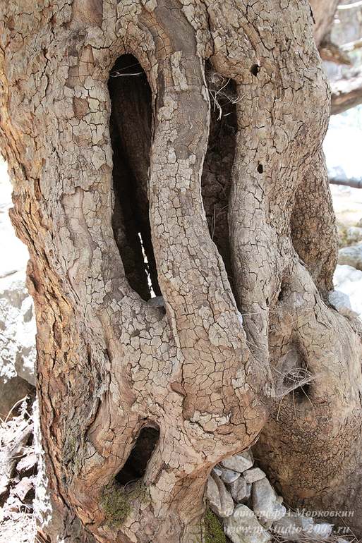 Внизу ущелья тенистые лесные тропы сменяются каменными развалами. Ручеек, переодически появляющийся в в оврагах превращается в небольшую речушку, через которую спасатели сделали из жердочек небольшие мостки. А каменные стены расписаны неземными узорами. Весной ущелье закрыто из - за половодья. Видимо горные потоки тающего снега за десятки или сотни лет сделали такие узоры.