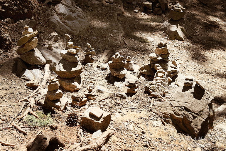 В нескольких местах встречаются пирамидки из камней. Какие то юмористы подперли несколько громадных камней небольшими тросточками.