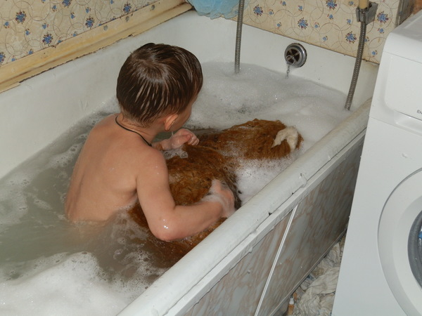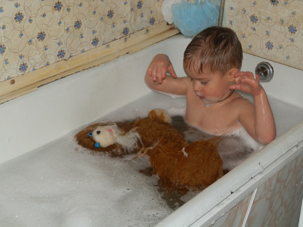"Мама,киса!"....И все бы ничего,но крик из.....ванной в которой он ныряет с пеной........Два прыжка и лицезрею "картину маслом":