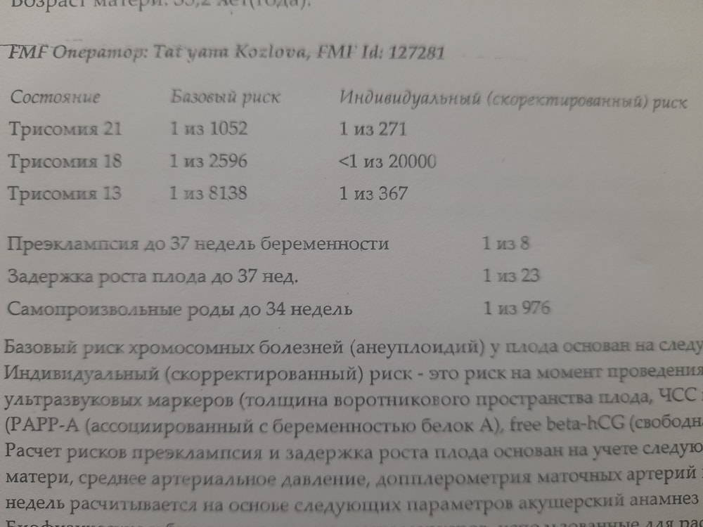 Итак, помимо промежуточных рисков по хромосомным аномалиям (см. мой предыдущий пост), результат первого скрининга оказался совсем неутешительным в плане акушерских рисков