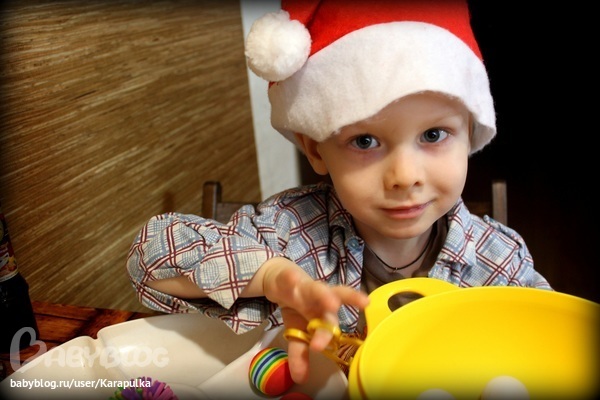 Хотя мы и не ходим в детский сад, называю это событие именно так, потому что это не "Ёлка", не представление для детей, а именно такое дедморозо-хороводное что-то. Проходило это в субботу, в нашем развивающем центре, куда мы ходим. Вся программа - около получаса. Песенки, хороводы, "ёлочка, гори!" - всё как обычно вообщем-то) На мой взгляд - было немного скомкано и скучновато, но детям вроде понравилось. Всего на эти занятия ходят около 30 чел, но группы разбиты по 5-6. И праздник тоже сделали для каждой группы отдельно, чтобы не было толпы. Обязательным условием было принести подарок для ёлочки, потому что у неё день рождения, и , конечно, он должен быть сделан малышом. Мы сделали большую конфетину в красивой обёртке. Очень старалась не мешать, чтобы Андрюня делал сам, но пришлось помочь ему с привязыванием верёвочки, это ещё самому сложновато...Что порадовало - Андрюшка единственный из группы рассказал Деду Морозу стихотворение, я даже прослезилась. После неудачного опыта с садом, он на этих занятиях тоже вообще ничего делать не хотел, сидел только смотрел на стульчике в сторонке. А сейчас даже чужому, не знакомому Деду Морозу не побоялся рассказать стих... Считаю это большим достижением!))