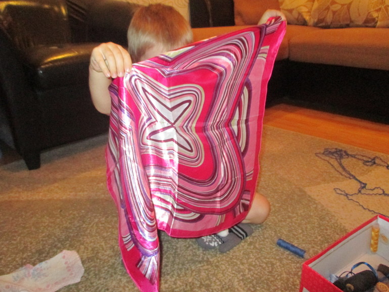 Ткани трогали,сравнивали по ощущениям, больше всего понравился шелк, нитки распределяли по цветам, пробовали наматывать клубок,