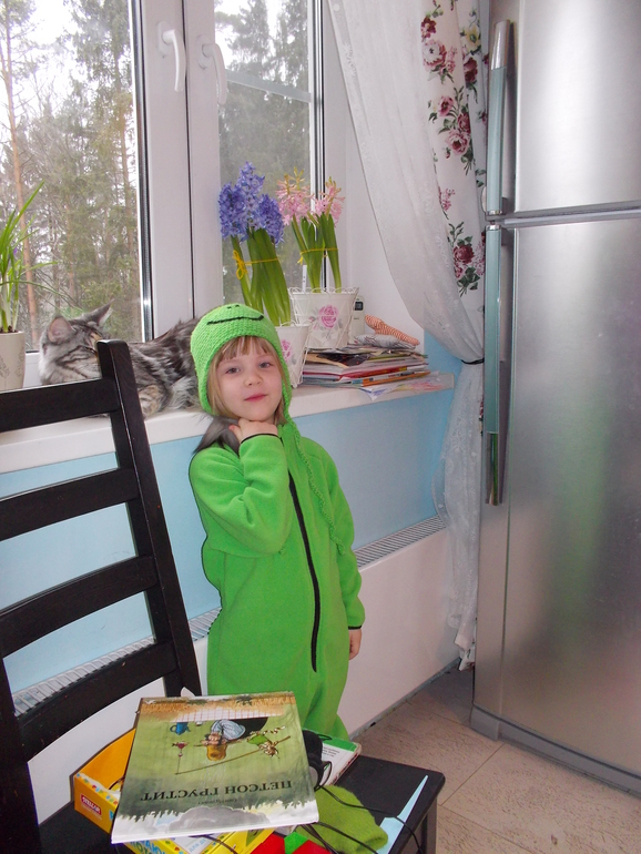 АлександраСаня у нас уже две недели дома в костюме лягушки ходит! А что..красиво-же....и комаров ловит и ест! вот..как-то так мы развлекаемся!!!