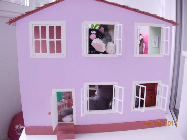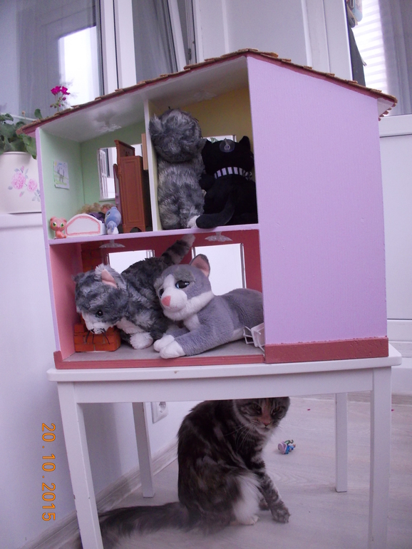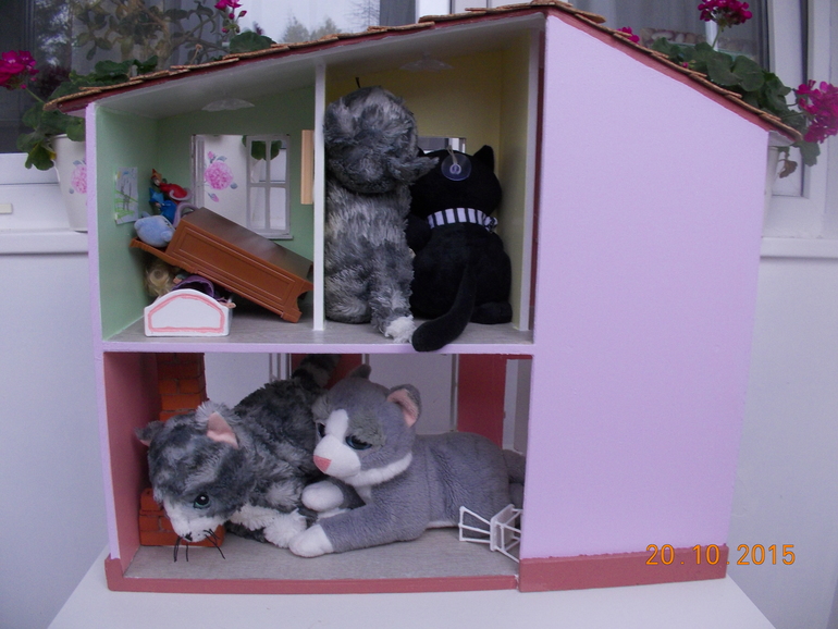 АлександраПапа наш делал дом для кукол-а оказалось что это дом для кошек! А как иначе-ведь у нас просто кошачий культ в доме какой-то! У Саши с кошками все! Одежда-носки, трусы, колготки, платья, купальники, шапки, косынки, варежки и перчатки, пижамки,сумки, в общем долго перечислять!. Мягкие игрушки кошки у нас в двух экземплярах одинаковые-для улицы и дома!!!