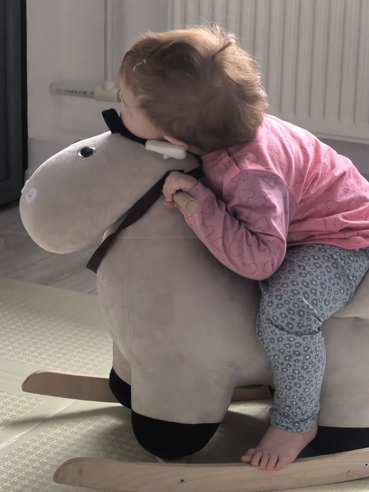 со мной наедине Ева всё время капризничает, просится на руки на улице, стала бить меня, короче, кошмар 😰 покупаю новые игрушки, развивашки, пытаемся вместе играть - концентрация Евы исчисляется в секундах. ей нравятся только качели на улице и конь-качалка дома. конь вообще эксплуатируется и в хвост, и в гриву - он начал скрипеть 🤣
