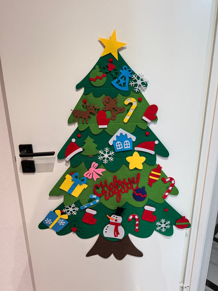 к новому году мы сильно не готовимся, купили только фетровую ёлку. я очень хотела живую, но Ева скорее всего её опрокинет или разобьёт все украшения. муж тоже бубнит, что везде будут иголки, короче, новогодний вайб отсутствует