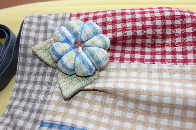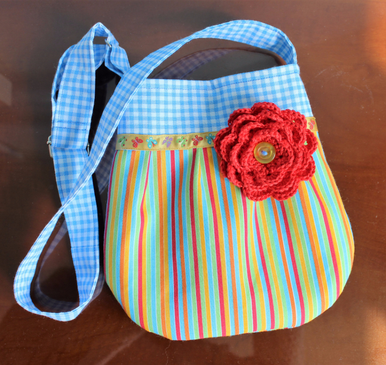 Сшилась летняя сумочка для девочки в подарок из хлопковой ткани, цветок связан крючком.