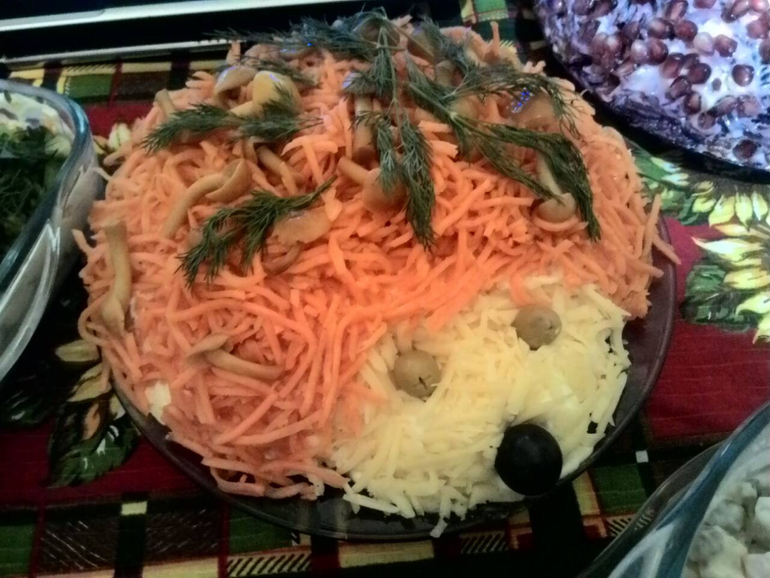 - Начинаем украшение ежика. Мордочку посыпаем сыром, из половинок маслин делаем глаза и нос. Иголки формируем из корейской моркови, выкладывая ее по всей поверхности салата. Сверху можно положить несколько небольших шампиньонов, кусочек яблока.