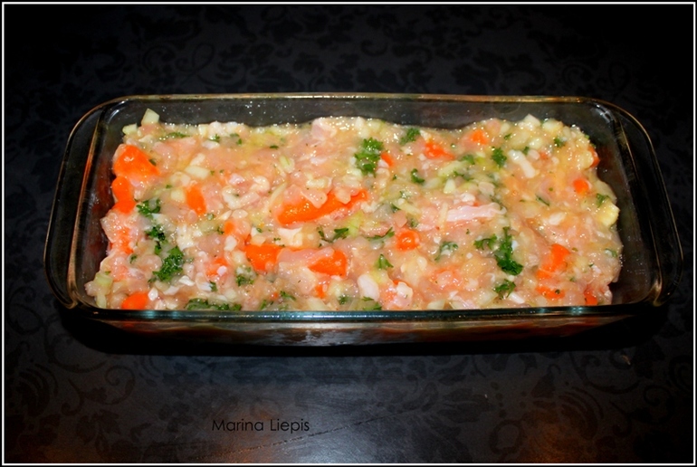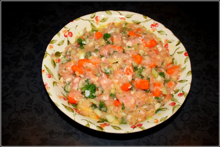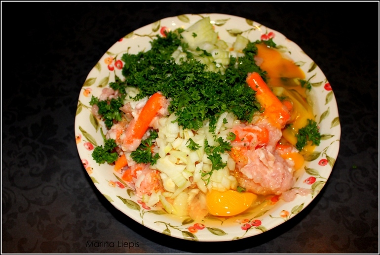 куриный фарш+овощи+лук+яйцо+зелень.....