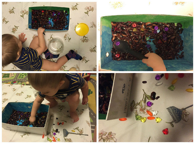 Сенсорную коробочку сделали тоже простую: фасоль и кристалики Фишер прайс: перебирали, сортировали по цветам и размерам
