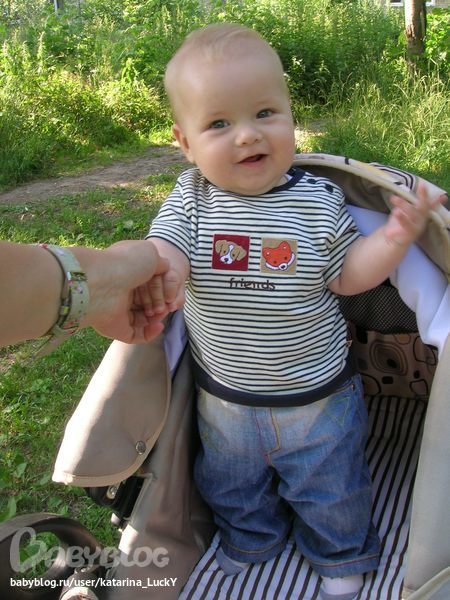 Сидит самостоятельно, ползать ленится. А еще начал стоять и ходить, когда его под руки берешь!