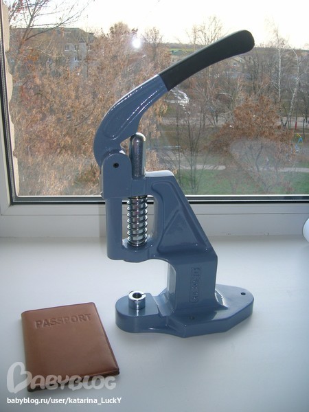 большой такой (специально пасспорт рядом положила для сравнения). Все делает: кнопки разные ставит, джинсовые тоже, пуговки обтягивает.. только пуансоны прикупить для разные типо-размеров)